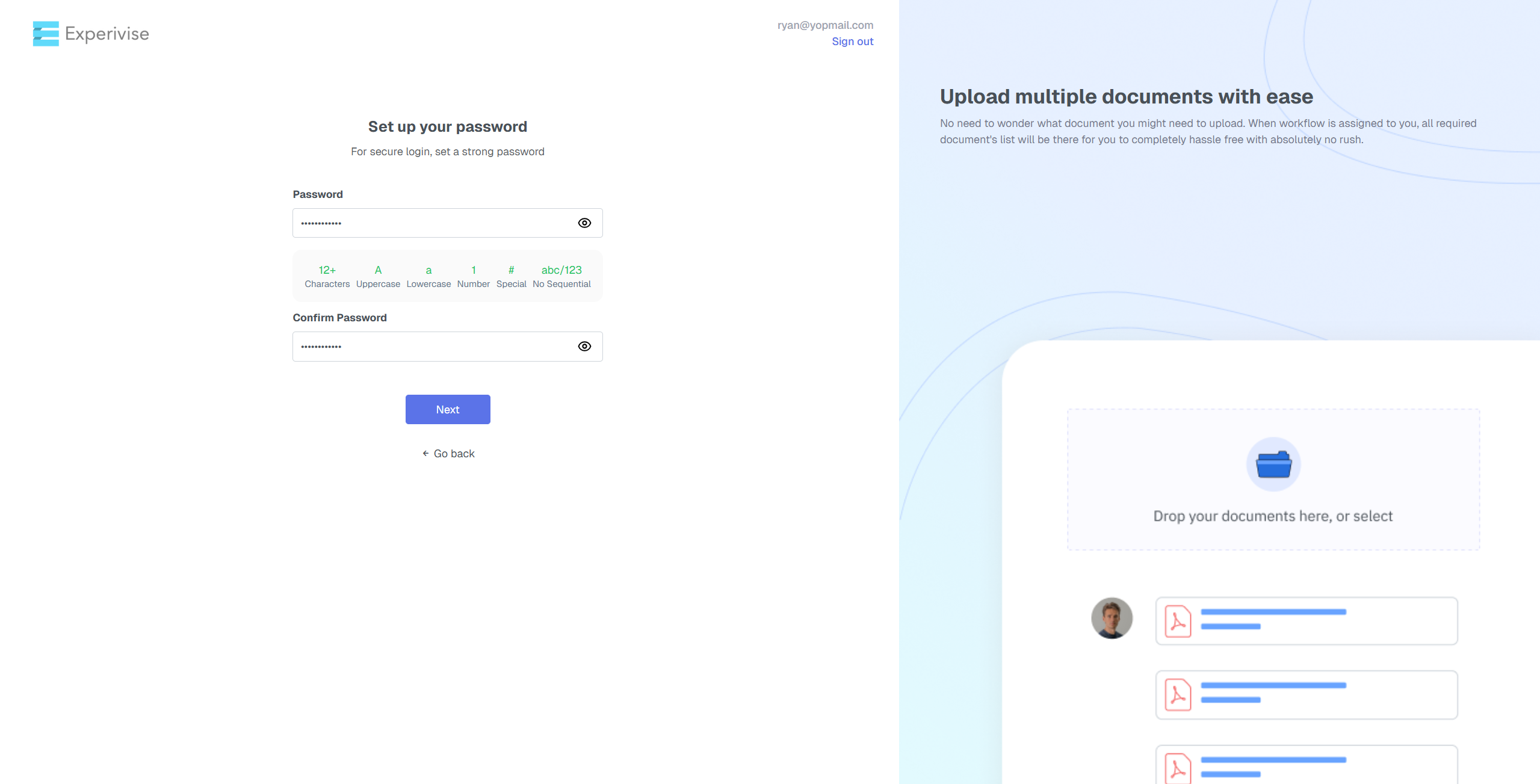 Create a strong password, confirm it, and ensure it meets the security requirements.