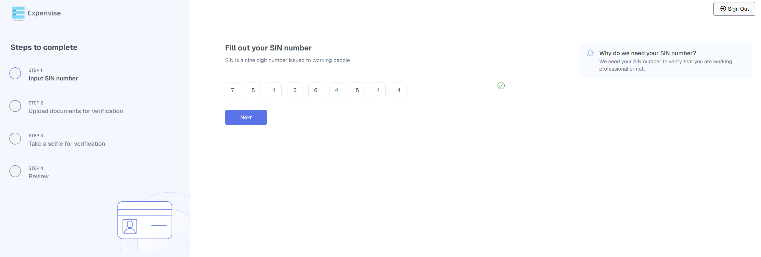 Enter your unique 9-digit SIN number in the designated field, then click 'Next'