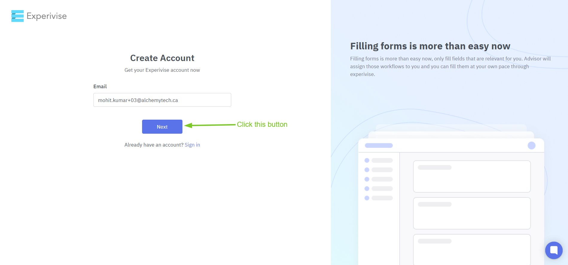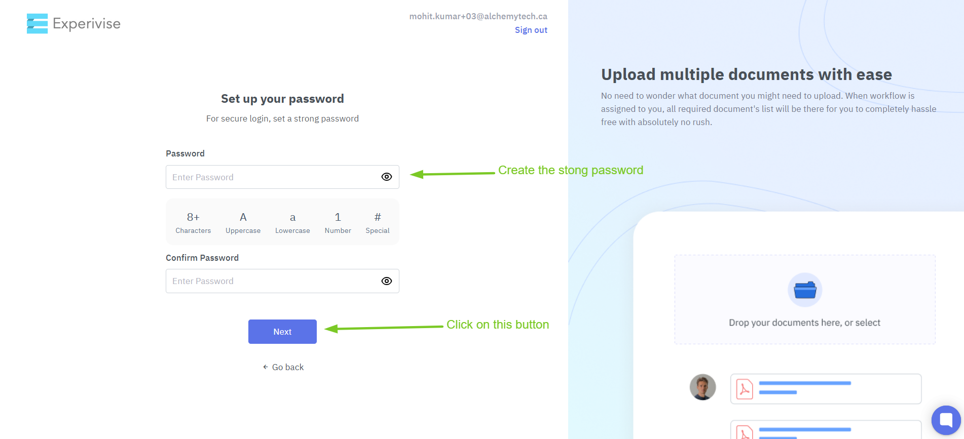 Create a strong password, confirm it, and ensure it meets security requirements.