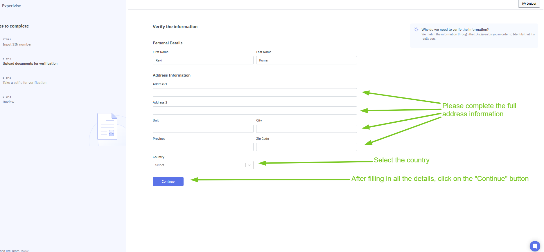 Carefully fill out all fields in the verification form, then click 'Continue.'